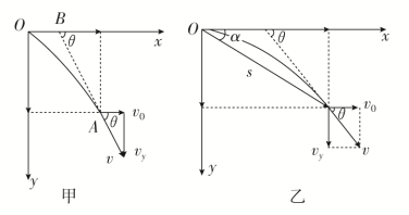 (2)做平抛运动的物体在任一时刻任一位置处,设其速度方向与水平方向的夹角为θ,位移与水平方向的夹角为α,则tanθ=2tanα。如图乙所示。其推导过程为tanθ=v0=v0·t=x=2tanα。
