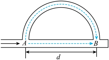 如图所示为干涉型消声器的结构图,声波达到管道A点时,分成两列声波,分别沿半圆管道和直管道传播,在
