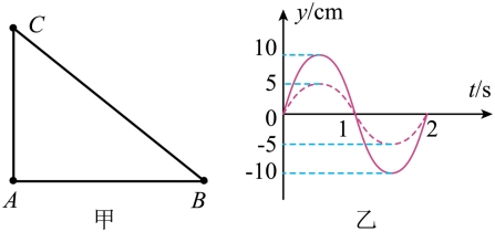 时,位于A、B处的两列横波波源同时开始振动,振动图像分别如图乙中实线、虚线所示,振动方向与平面ABC垂直,已知波长为