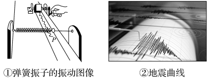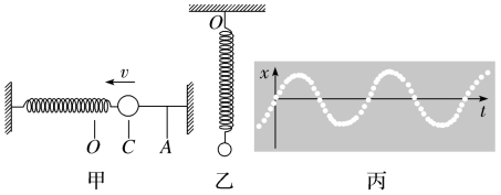 情境:图甲为水平方向的弹簧振子,利用频闪照相法得到其振动图像如图丙所示;图乙为竖直方向的弹簧振子,利用频闪照相法得到其振动图像也如图丙所示。
