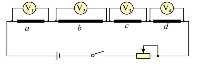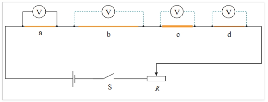 (24-25高二上·湖南娄底·期末)a、b、c、d是四段不同的金属导体,在长度、横截面积和材料三个因素中,b、c、d跟 a相比,分别只有一个因素不同。b与 a,长度不同,横截面积、材料相同;c与 a,横截面积不同,长度、材料相同;d与 a,材料不同,长度、横截面积相同。下列说法正确的是( )