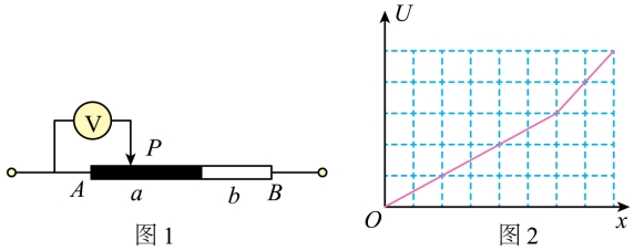 【详解】电阻丝上电流不变,电压表示数U与电阻成正比,由图可得a段电压大于b段电压,但是移动单位长度,a段上电压增加量小于b段电压增加量,所以