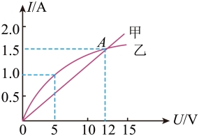 (24-25高二上·四川广元·期中)如图为两元件甲、乙的伏安特性曲线,两图线交于A点,A点坐标为(12V,1.5A),甲的图线(直线)与横轴所成夹角θ为30°。下列说法正确的是( )