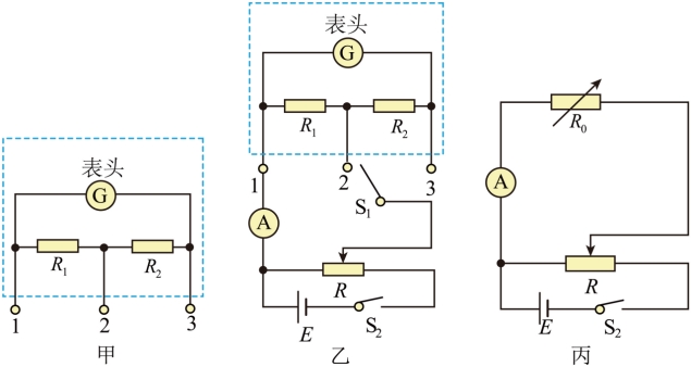 ,内阻rg未知,R1和R2阻值也未知,电流表的两个量程未知。某同学为了测量该电流表的两个量程,并测量rg、R1、R2的阻值,设计了如图乙和丙所示的电路。
