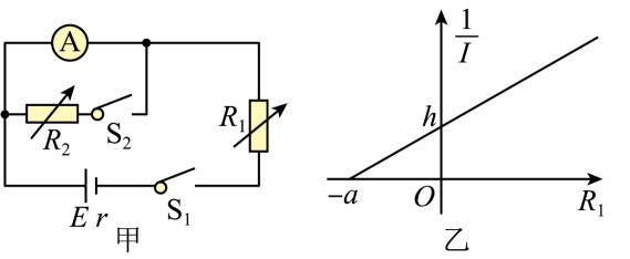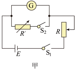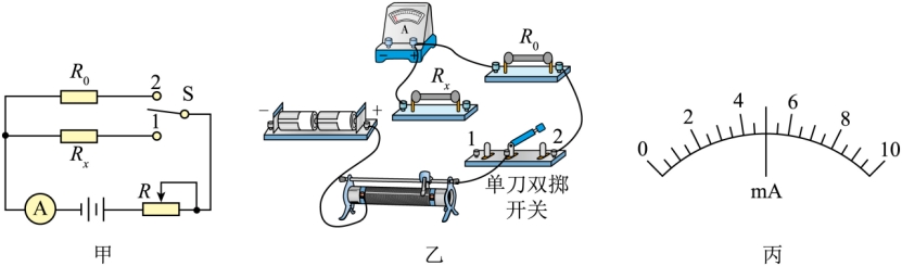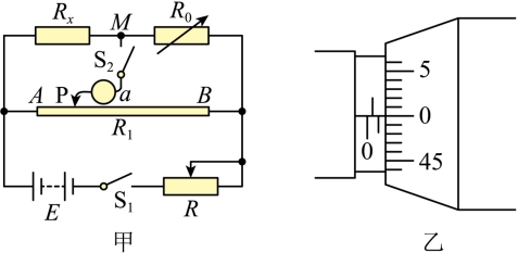 根据图甲的电路图连接电路,将R0调到某一数值,滑片P与金属丝某位置连接。闭合开关S1,试触开关S2,观察电表a的指针偏转情况;适当左右移动滑片P的位置,直至闭合开关S2时,电表a的示数为零;测出滑片P左右电阻丝AP、BP的长度L1、L2,读出此时电阻箱接入电路的阻值R0。