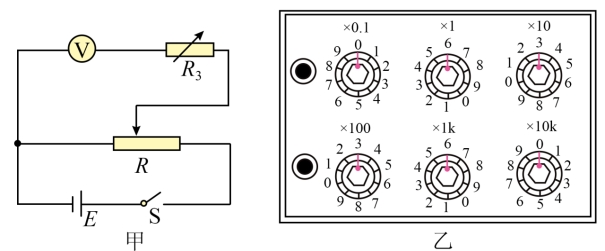 (2)为了精确测量此电压表的内阻,小组成员用半偏法测此电压表的内阻。设计的电路如图乙所示,其中:电阻箱R(最大阻值9999.9Ω),直流电源E(电动势6V),滑动变阻器最大阻值为20Ω。实验时,将图乙中滑动变阻器滑片移到最(选填“左”或“右”)端,闭合开关