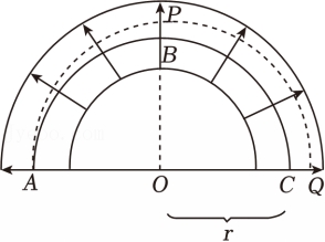 4.某种静电分析器简化图如图所示,在两条半圆形圆弧板组成的管道中加上径向电场。现将一电子a自A点垂直电场射出,恰好做圆周运动,运动轨迹为ABC,半径为r。另一电子b自A点垂直电场射出,轨迹为弧APQ,其中PBO共线,已知BP电势差为U,