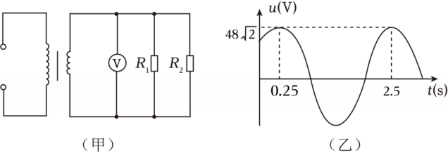 2.某理想变压器如图甲,原副线圈匝数比4:1,输入电压随时间的变化图像如图乙,