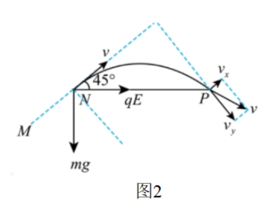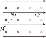 ,NP水平向右。带电量为q,速度为v,质量为m,当粒子到N时,撤去磁场,一段时间后粒子经过P点,则()