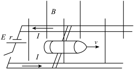 电磁炮原理简图如图所示,间距为L的平行导轨水平放置,整个空间有竖直方向的匀强磁场;电源电动势为E、内阻为r,导电金属杆安装上炮弹垂直放在导轨上,已知炮弹与金属杆总质量为m,电阻为R,导轨电阻不计,忽略一切摩擦。闭合开关后,炮弹沿图示方向运动,下列说法正确的是( )