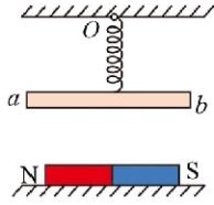 如图所示,放置在水平面上的条形磁铁上方,以O点所在竖直线为轴可以水平自由旋转的轻弹簧悬挂了一直导体棒,某一时刻给该导线通以由a向b方向的电流(作为计时起点)。磁铁始终保持静止,下列说法正确的是( )