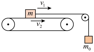 (多选)如图所示,一质量为m的物块用水平轻质细线连接,细线绕过光滑的滑轮后其下悬挂一质量为m0的物体,物块放在水平传送带上,水平传送带以v2的速度顺时针匀速转动,物块以初速度v1向右运动,传送带与物块间的动摩擦因数为μ。则关于物块m所受的摩擦力f,下列说法正确的是( )